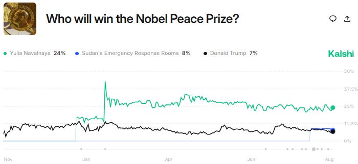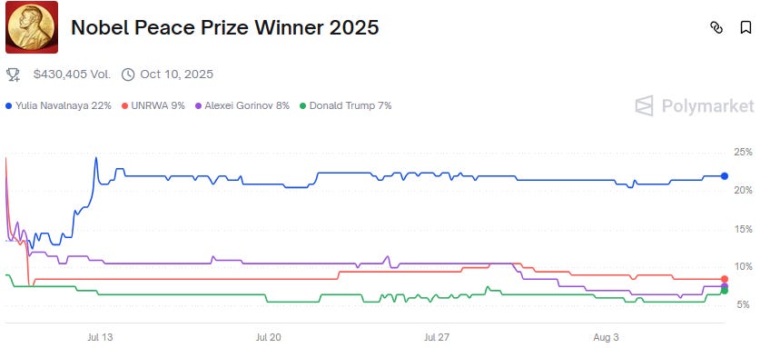 The real Polymarket prediction on the Nobel Peace Prize is led by Yulia Navalnaya. Trump is still in the list, but he is down to fourth place.