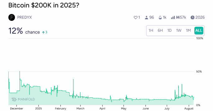 Manifold’s Bitcoin-$200K market has increased its probability by not as much.