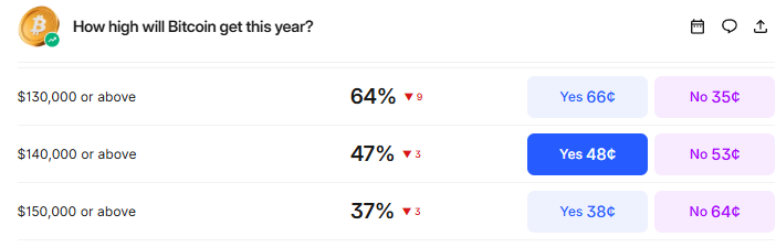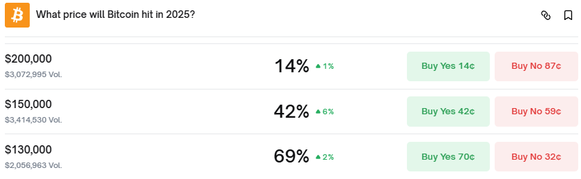 On Polymarket, the percentage of traders who believe that BTC will hit $150,000 in 2025 has increased by 6%.
