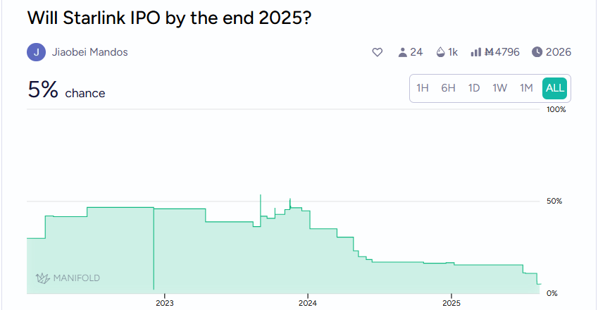 With Starlink getting more prominent by the day, people are anticipating when it will go public. On Manifold, you can predict whether Starlink will IPO this year.