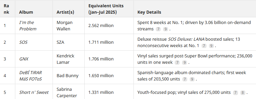 From January to July 2025, these are the top-selling music albums, per a list from Accio.