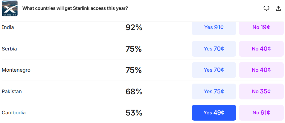 Starlink’s popularity isn’t going unnoticed by prediction markets. On Kalshi, you can predict which countries will get Starlink access in 2025.