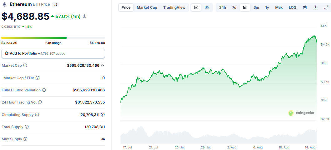 As of writing, Ethereum is trading around $4,688.85.
