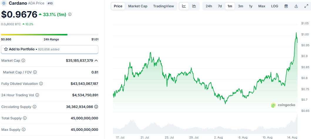 Cardano (ADA) has been experiencing a notable price surge, with its price recently climbing to around $0.88 and, at one point, even breaking the $1 mark.