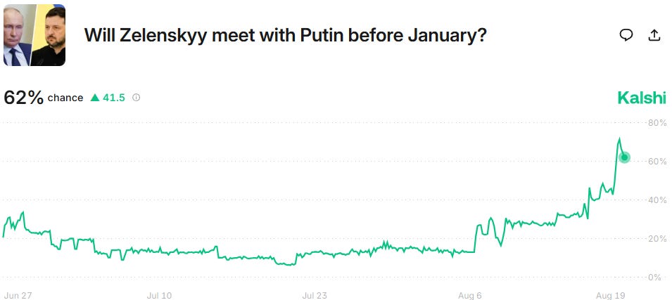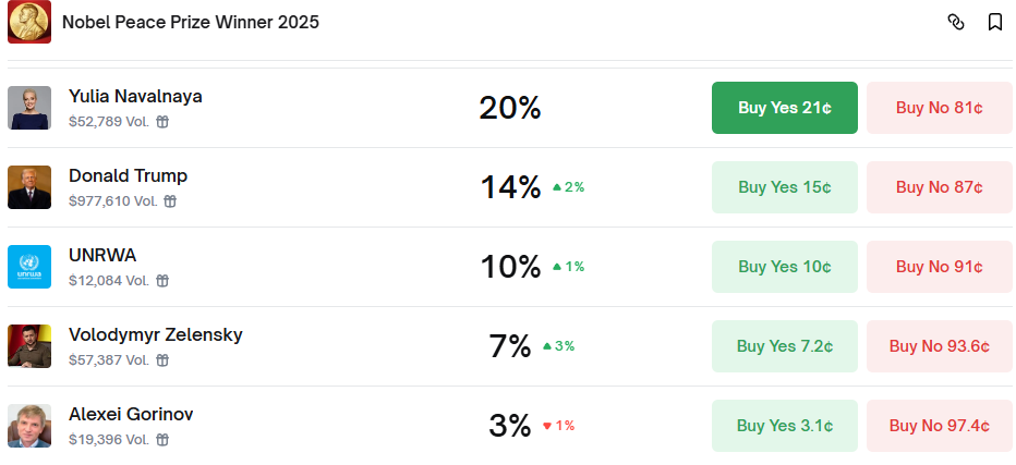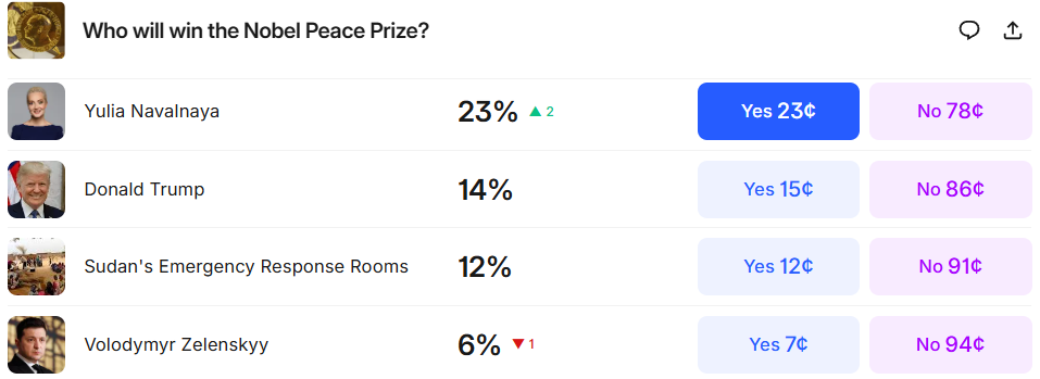 Newsweek reports Trump’s Nobel odds have surged ahead of the Alaska summit. But how about on prediction markets?