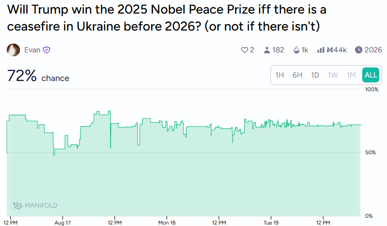 Manifold traders are amping up their expectations. They’re 72% sure that Trump will win the Nobel if a ceasefire happens in Ukraine before 2026.