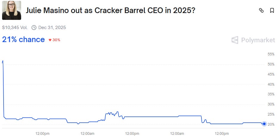 Now, people are predicting the future of current Cracker Barrel CEO Julie Masino. Polymarket traders say that there’s a 21% chance that Masino is removed from her position this year.
