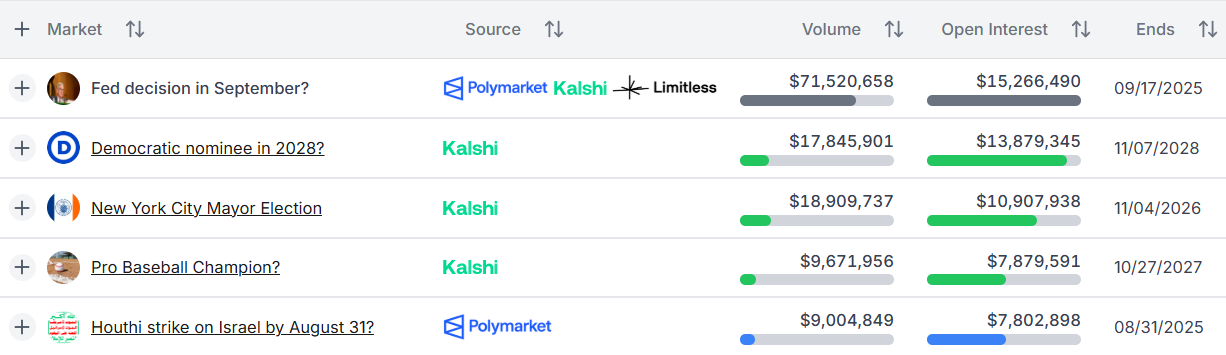 See the most trending markets on prediction platforms like Polymarket, Kalshi, and Limitless.
