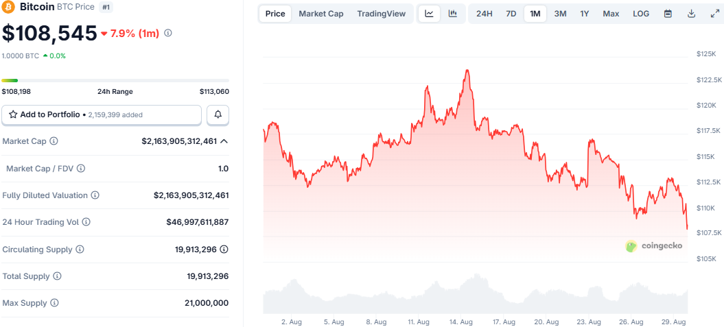 As of August 29, 2025, Bitcoin (BTC) is trading around $108,545.
