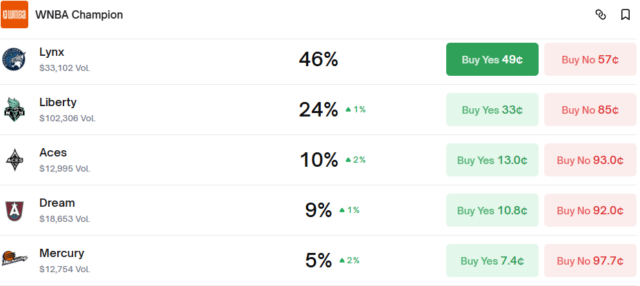 Interpretation: Markets nudged toward Lynx and Aces options, but left room for moves after the Golden State Valkyries defeated the New York Liberty yesterday. This is a fourth straight win that pushed the Valkyries to the brink of an unprecedented expansion-year playoff berth. Expect incremental tightening on Valkyries’ playoff “Yes” lines and a light Liberty drift after another off-night.