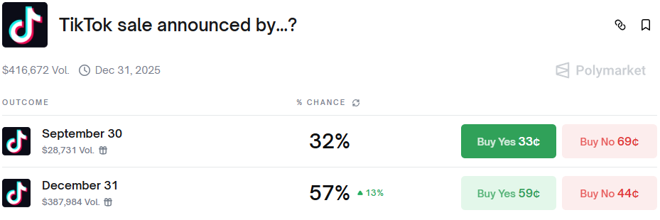 Traders are piling in here, with 57% betting on a sale announcement by December 31. This surge ties directly to Bloomberg's report on a framework deal between US and Chinese officials, setting up President Trump's call with Xi Jinping this Friday.