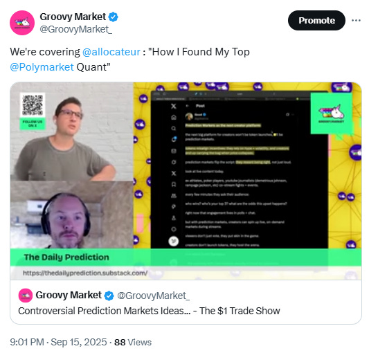 If you have insights on prediction markets and a knack for writing, we invite you to submit your work for consideration. Selected contributions will be featured in this newsletter, reaching an audience of over 1,000 engaged readers. Please send your piece to contribute@groovymarket.xyz.