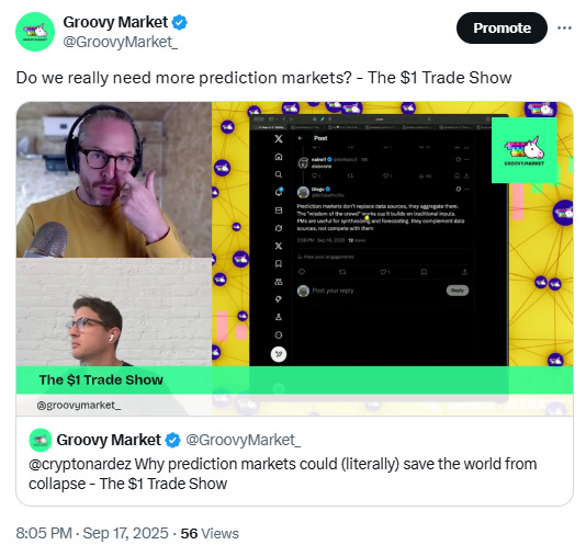 If you have insights on prediction markets and a knack for writing, we invite you to submit your work for consideration. Selected contributions will be featured in this newsletter, reaching an audience of over 1,000 engaged readers. Please send your piece to contribute@groovymarket.xyz.