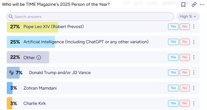It’s a cultural Rorschach test: Pope Leo XIV (27%), AI as a concept (25%), and Trump/Vance (7%). The inclusion of AI is striking. Markets are already treating “technology” as a person. That says more about 2025’s zeitgeist than any magazine cover.