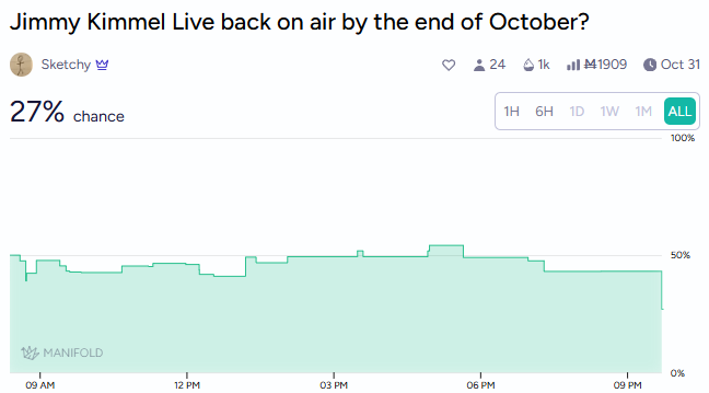 After some controversial remarks on the Charlie Kirk news, the suspension of Jimmy Kimmel Live! after controversial remarks has bled into prediction markets. Entertainment news (Variety) suggests ABC executives are weighing advertiser pressure against Kimmel’s contract.