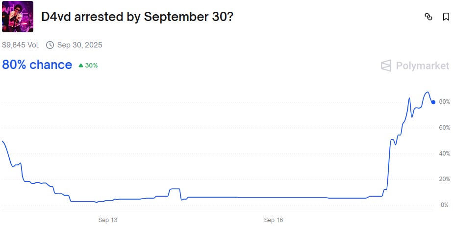 Rumors of the young artist d4vd’s legal troubles have spilled from TikTok to X, where #d4vd trended yesterday. The market sits around 80% yes, fueled by court filings and viral videos claiming “evidence.”