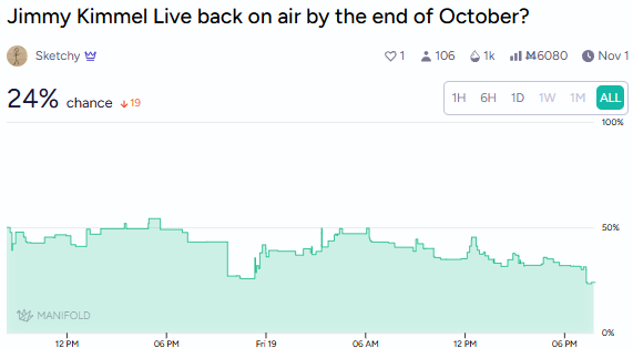 Such is the attention that the Jimmy Kimmel saga is getting. Prediction markets are saying that there’s only a 24% chance that Kimmel returns to ABC by the month’s end.