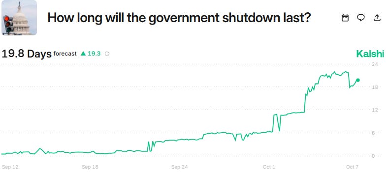 USA Today notes a 35% chance of it dragging past 15 days, amid all the budget battles. People want this to be resolved before it severely impacts Q4 corporate earnings or triggers a serious market panic.
