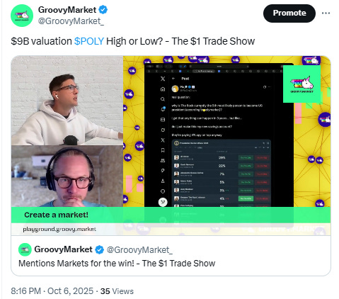 Some people are also pushing their luck in seeing this government shutdown end this week. You can make this prediction on Groovy Market, where you can create markets and earn rewards.