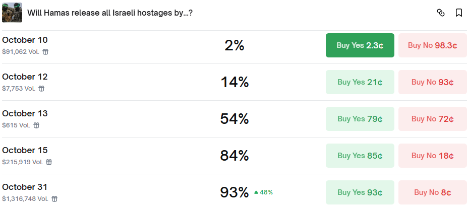 The “yes” probability sits at 93% for the Israeli hostages being released on October 31. Traders are riding the wave of celebrations in Gaza and Tel Aviv, per Reuters, but underlying caution lingers. Remember, past deals have faltered.