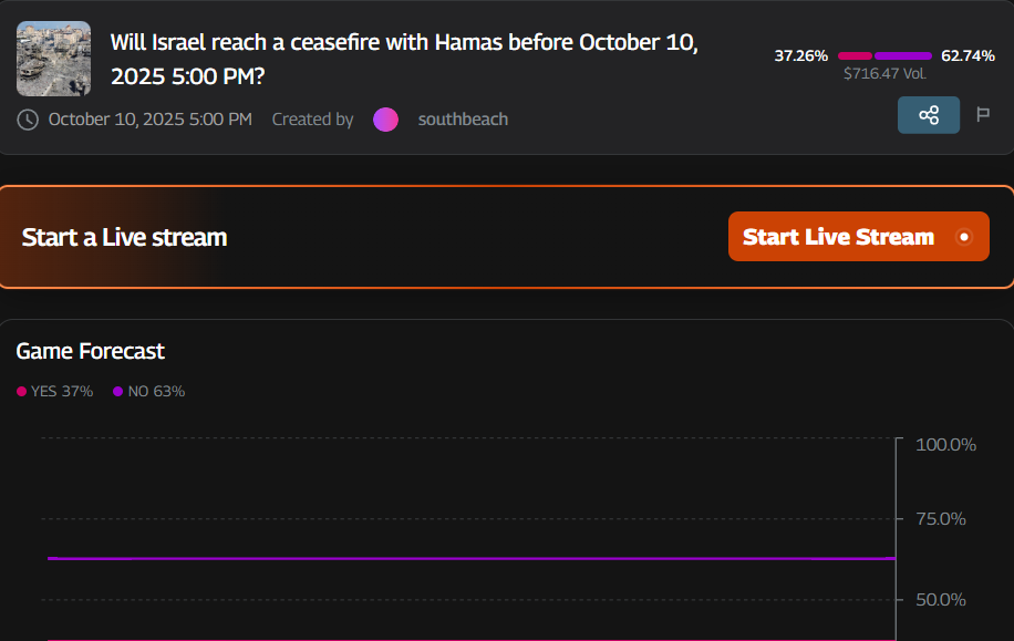 Word has gone out that Israel and Hamas have agreed on a ceasefire. So yeah, this prediction on Groovy Market below should be resolved to a “yes.”