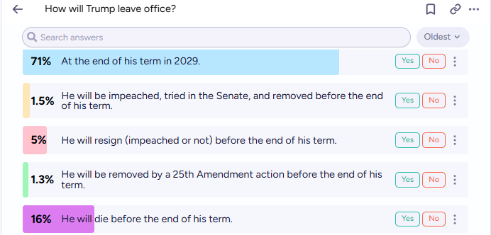 The leading prediction, with a 71% probability, is that Trump will leave office “At the end of his term”. Other, more dramatic outcomes, such as impeachment or resignation, are given much lower odds, at 1.5% and 5%, respectively.
