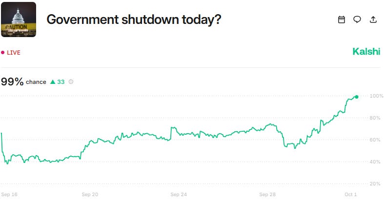 News flow framed a high probability of a lapse in funding into October 1. Traders then used Kalshi’s timestamp rules to hedge headline risk and play the binary.