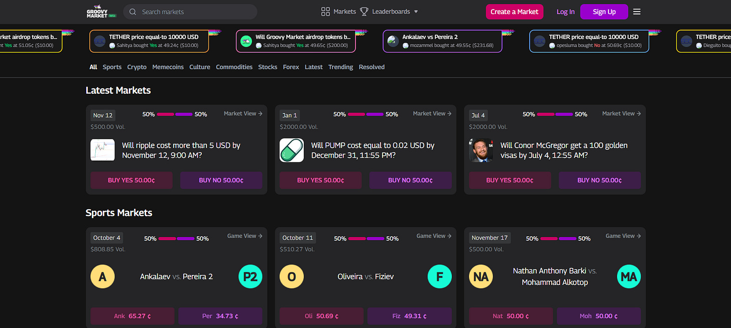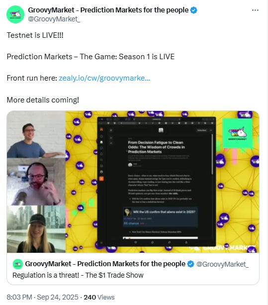 If you have insights on prediction markets and a knack for writing, we invite you to submit your work for consideration. Selected contributions will be featured in this newsletter, reaching an audience of over 1,000 engaged readers. Please send your piece to contribute@groovymarket.xyz.
