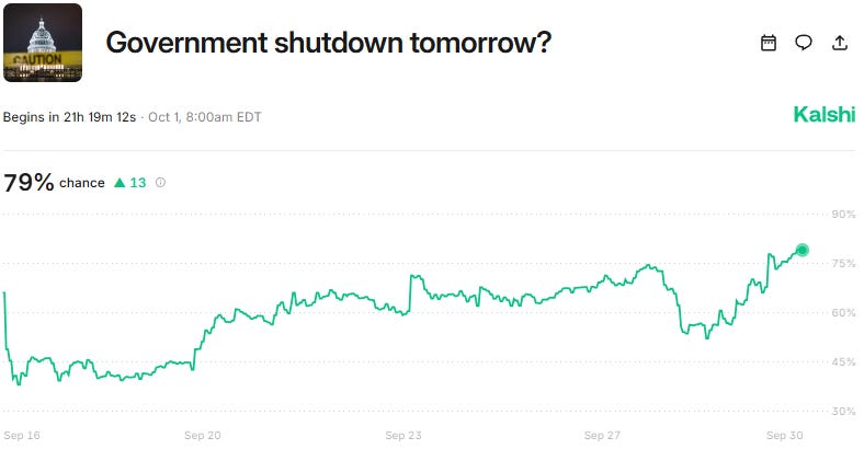 With the midnight deadline just hours away, the crowd on Kalshi is overwhelmingly convinced that a shutdown is inevitable. The market is giving it an 79% probability, a stark reflection of the public’s loss of confidence in Congress’s ability to govern.