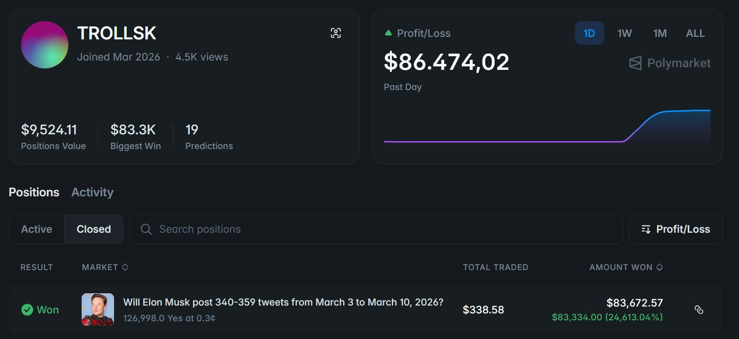 A trader reportedly turned $200 into $83,000 betting that Elon Musk would not tweet during a specific market window - Read